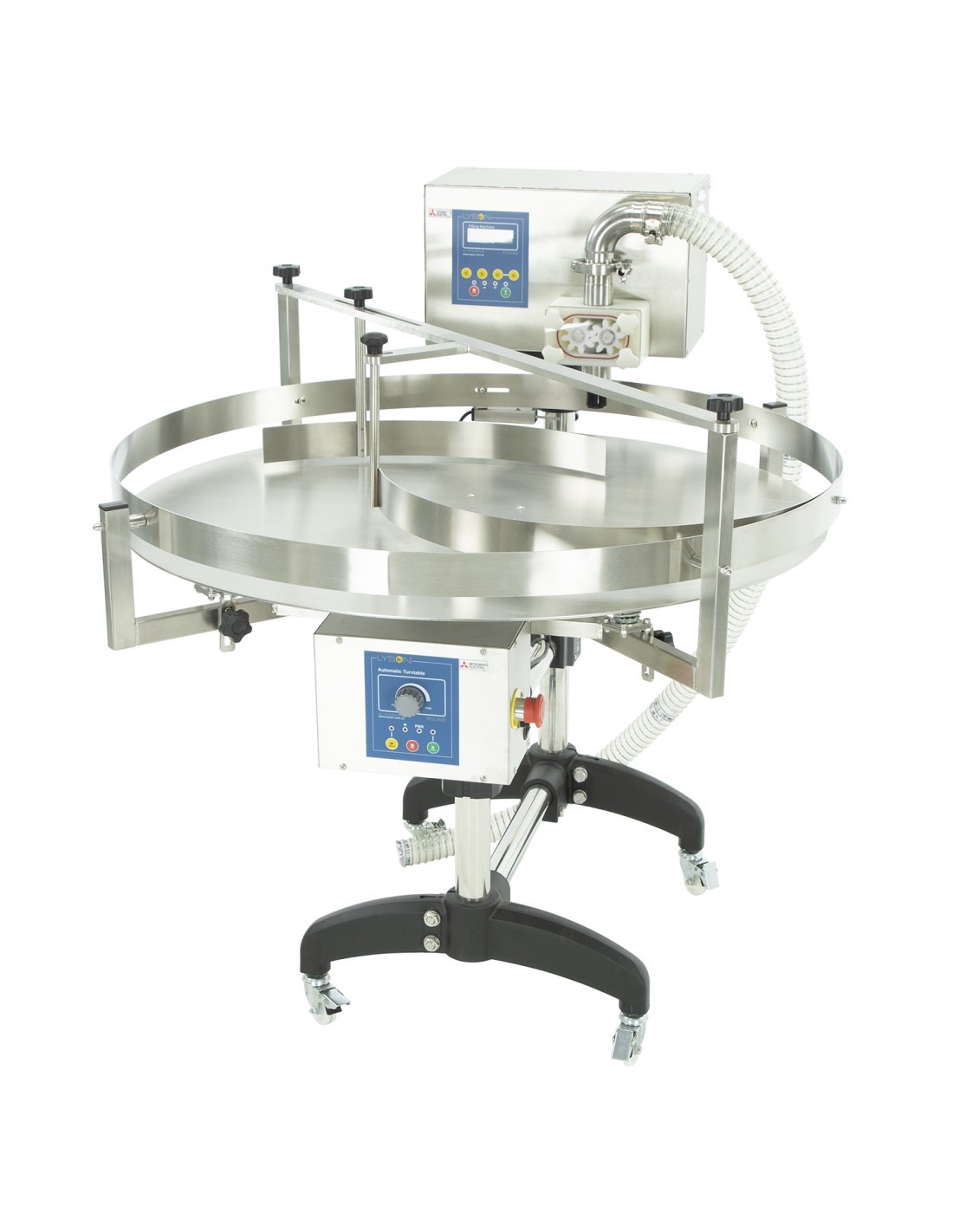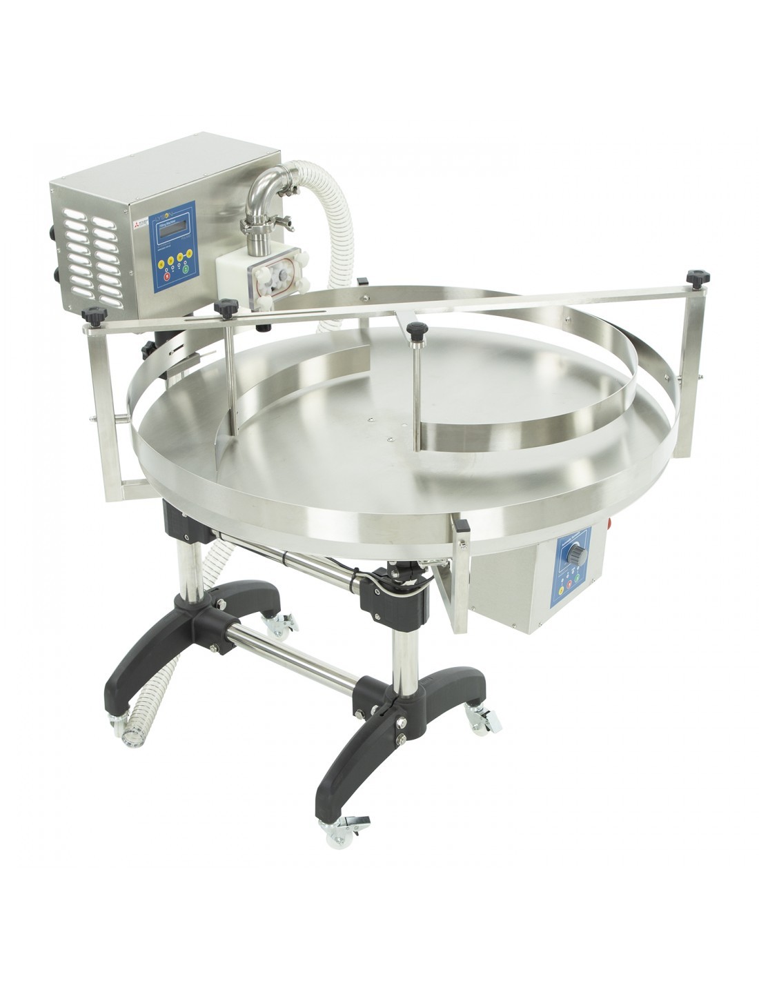 - Obrotowego blatu ze stali nierdzewnej, który jest podzielony na dwie części za pomocą prowadnicy do słoików. Pierwsza część przeznaczona jest na puste słoiki do napełnienia, a w drugiej części gromadzą się napełnione słoiki.