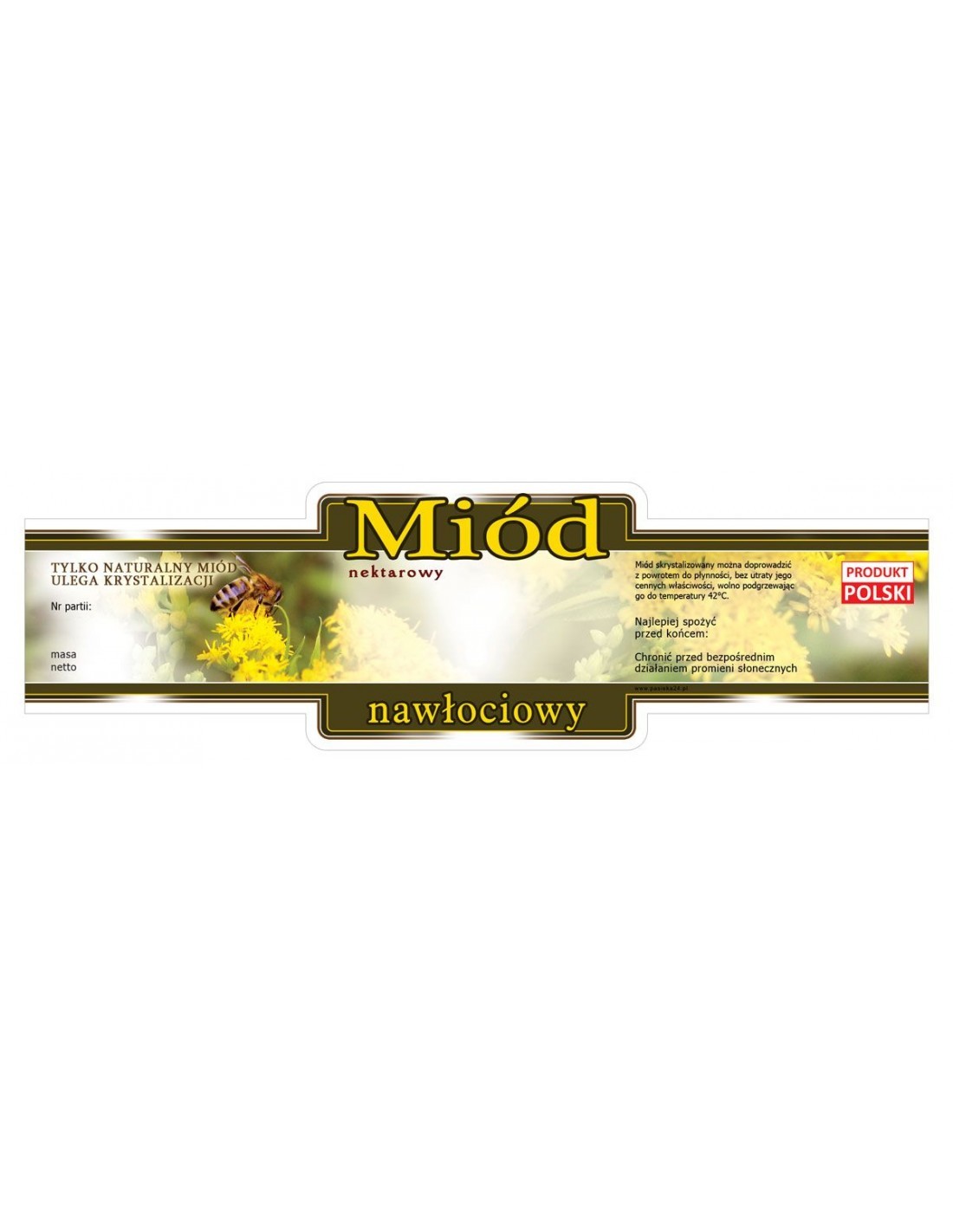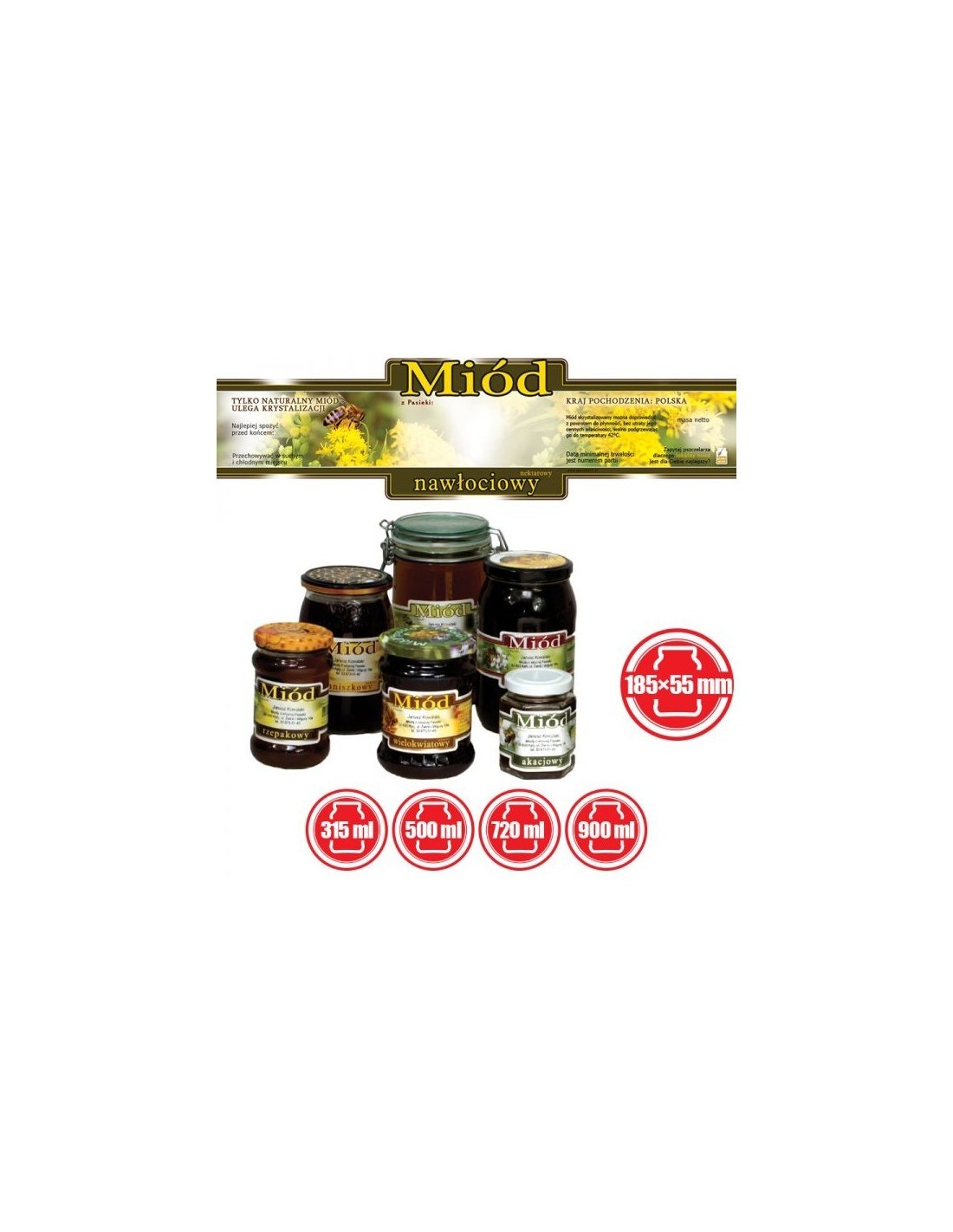 Do etykiety polecamy również nasze ciekawe nakrętki na słoiki oraz banderolki proste 22x142mm, w naszej ofercie można znaleźć również broszurki informacyjne lub banery, proponujemy także ciekawe opakowania na prezent do miodu.