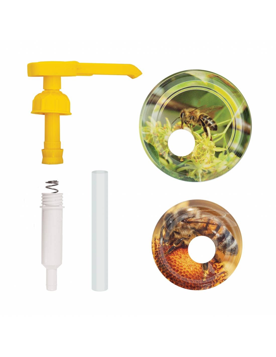 Dozownik plastikowy do miodu z nakrętkami (1szt) -Dozownik do miodu w komplecie z dwoma nakrętkami na duże i małe słoiki. Regulowana wysokość pozwala na nakręcanie do niskich i wysokich słoików.
