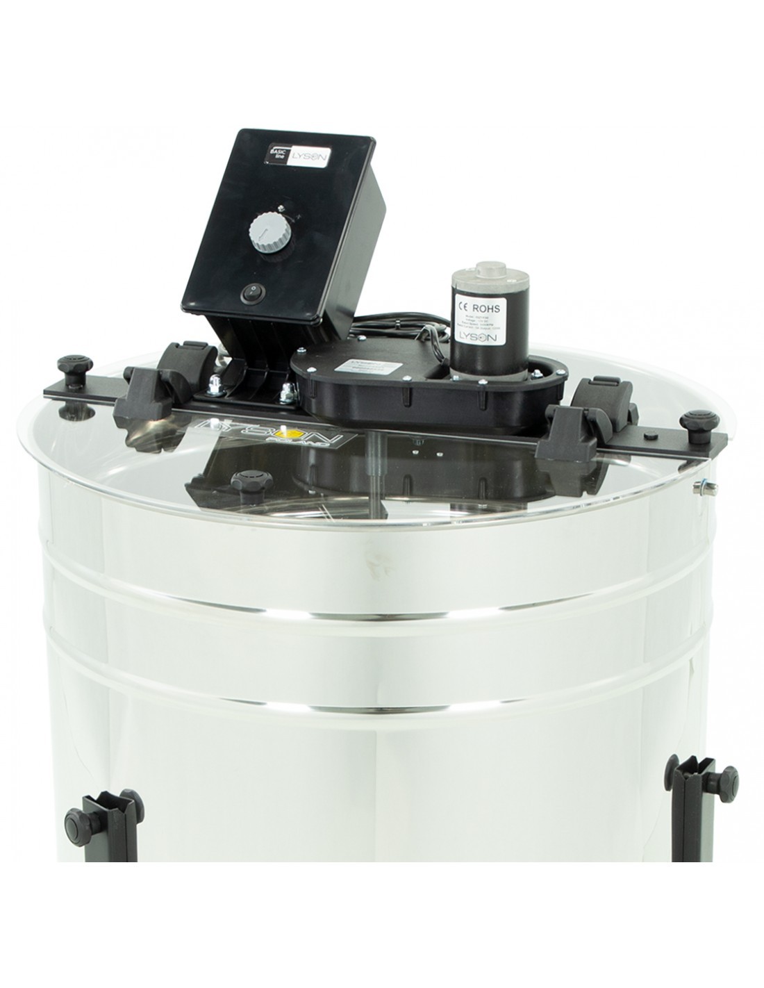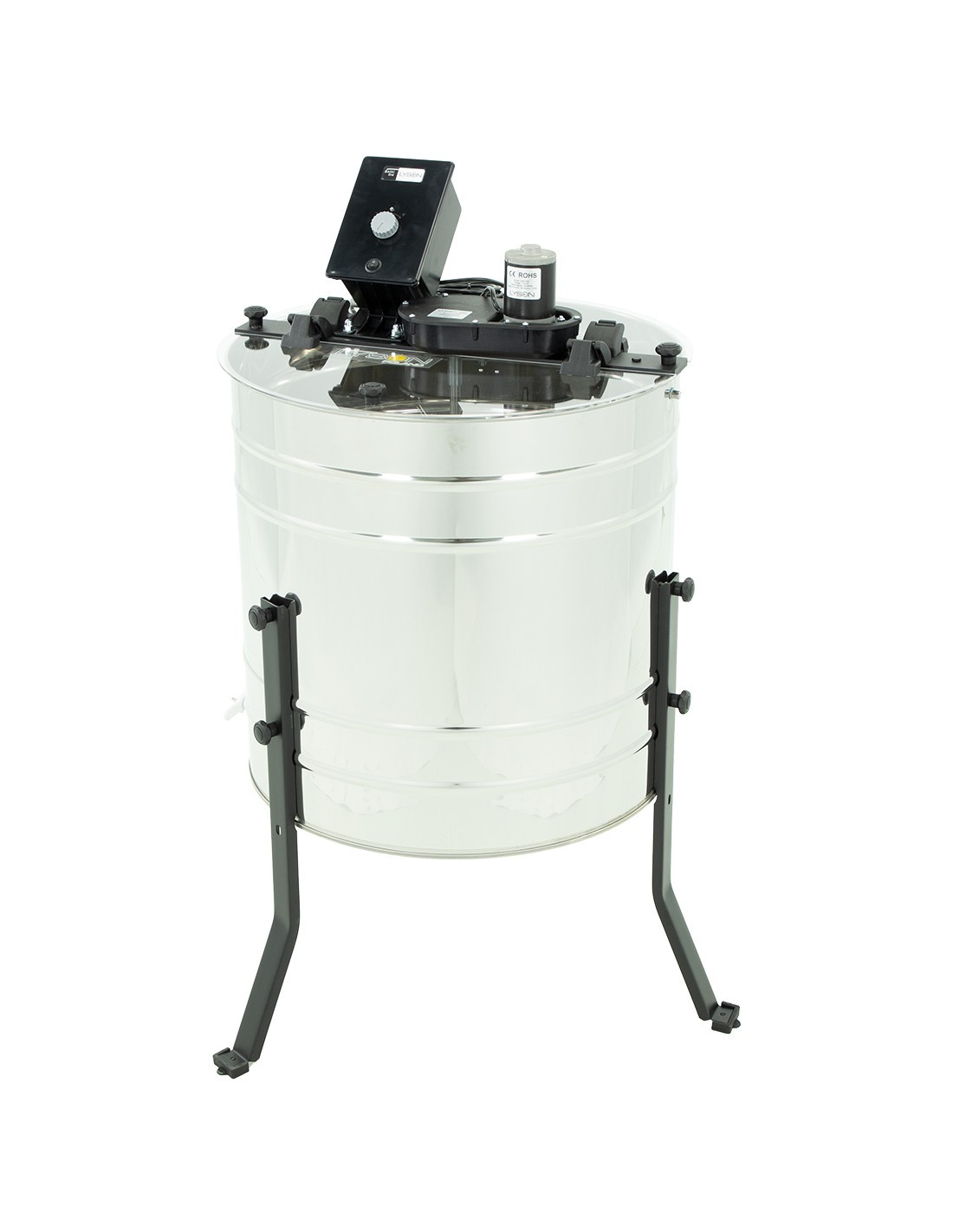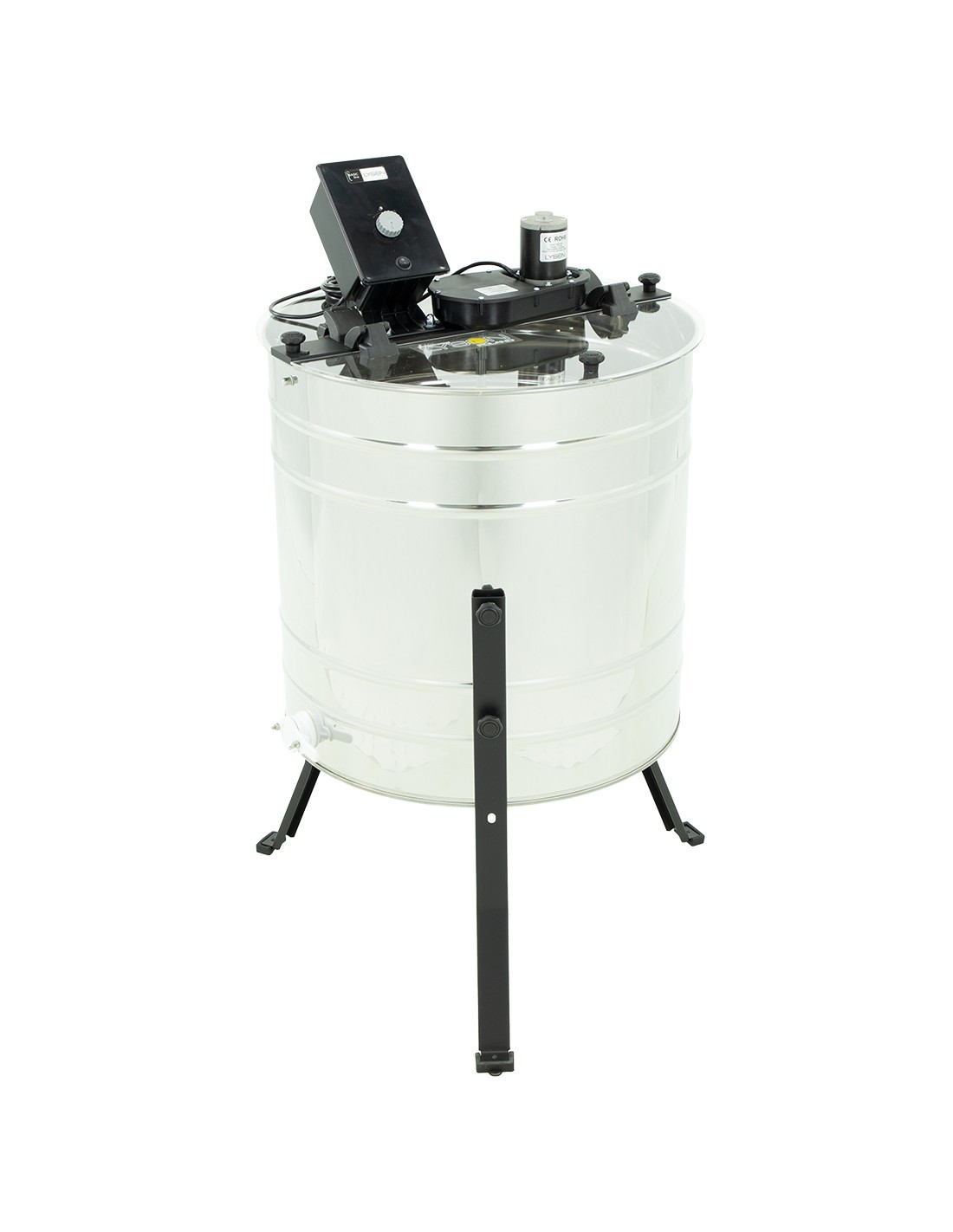 Posiada blokadę elektryczną o zatrzymaniu awaryjnym po otwarciu pokrywy podczas pracy miodarki.