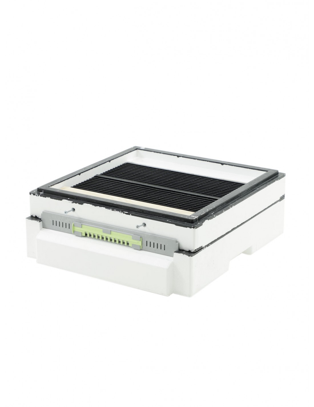 Segmentowy poławiacz pyłku to styropianowa rama w której zamontowana jest płytka strącająca odnóża pyłkowe a pod nią znajduje się siatka pełna oczek o średnicy 3,5mm przez które przelatuje pyłek na tackę.